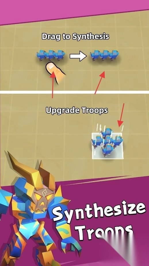 2、在合成界面,将相同部队(比如蓝色单位)进行拖动,按照“Dragtoynthesis”的操作指示,对部队进行升级,以此提升战力。