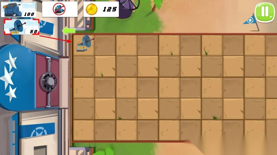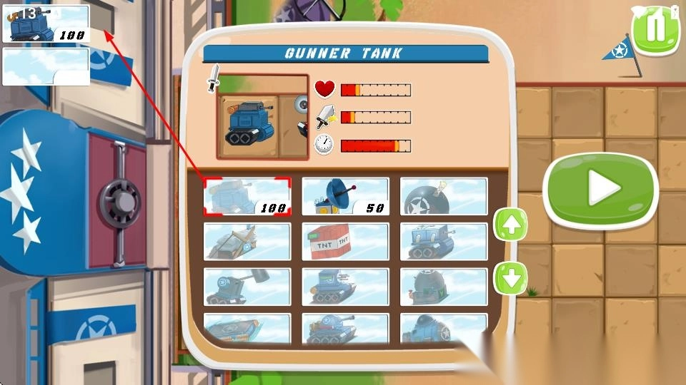 1. 在坦克选择页面,选定坦克,耗费金币把它布置到战场方格之中,组建防御与进攻的阵型。