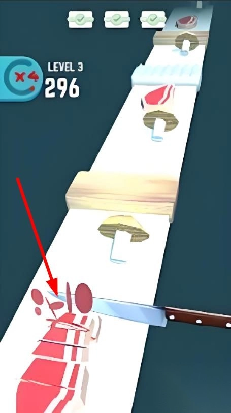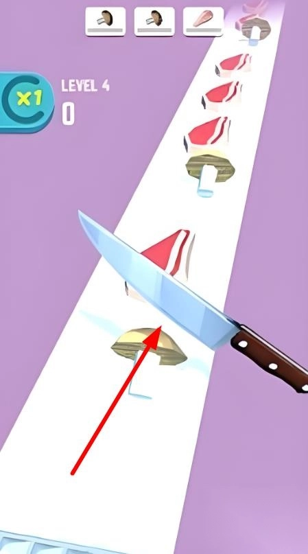 1. 进入界面后,密切注视传送带,通过滑动屏幕来控制菜刀上下移动,精准对准食材并迅速切割。切割过程中,要躲开同时传送过来的障碍物,并且留意食材切割的形状要求。