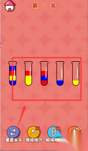 1、开局先观察所有试管的液体颜色分布,理清大致排序思路。优先将颜色单一的液体转移出来,避免后续操作混乱。