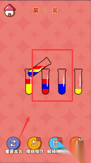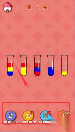 1. 基础操作逻辑为,通过点击来选择源试管与目标试管,从而实现液体转移。要留意试管的容量限制以及颜色分层规则。