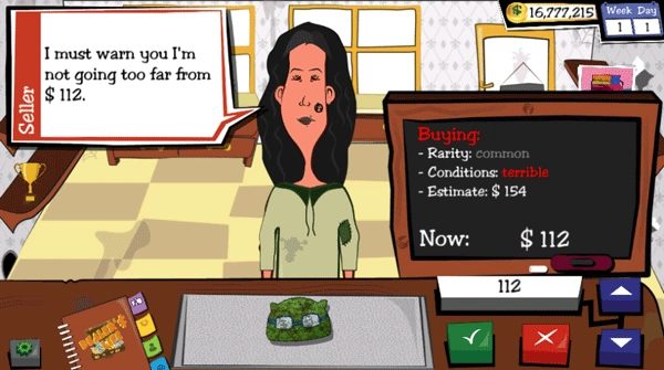 4、买入只要是价值高的都有购买的必要,因为最终还是能以更高的价格卖出去,买入价格同样参考顾客贪婪指数但是卖东西我们可以挑选顾客,买东西不行,能拿下的时候一定要拿下,一般开天价的,而且价格讲不下去的,直接开估价就能拿下。