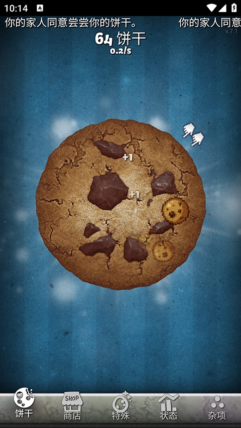 1. 玩家进入游戏后,通过疯狂点击屏幕里的大饼干,从而获取曲奇小饼干。