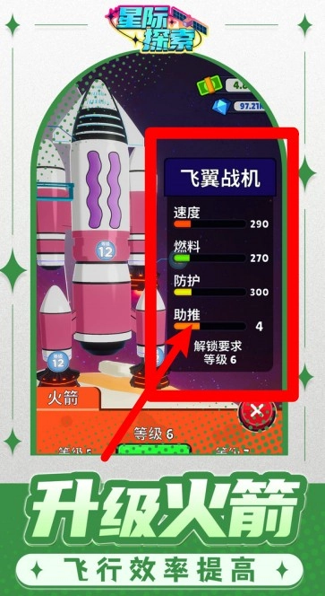 3. 火箭属性升级:火箭模块具备速度、燃料、防护以及助推等一系列属性,借由升级来提高整体性能,使飞行效果得到显著强化。