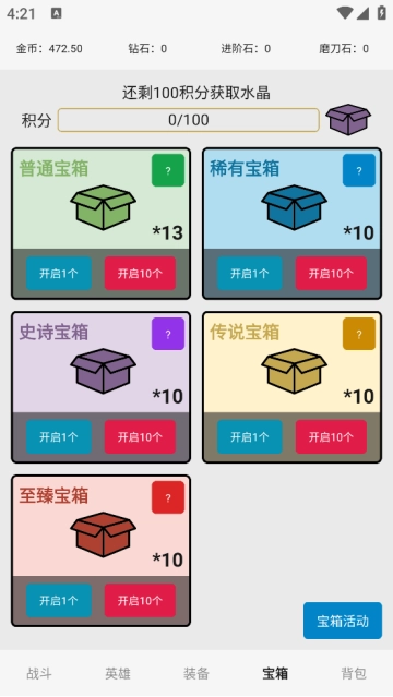 3、抽奖获得英雄搭配闯关,刚进入游戏没有英雄需要去抽一发十连,然后上阵闯关。每闯关一关会获得金币和宝箱。