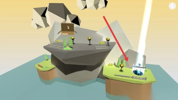 2、踏入第1关的场景,仔细观察地形,留意悬崖与岛屿的分布。引导戴着黄帽的火柴人移动,依照箭头的指示,规划合理的路径,注意避开落石等各类危险。