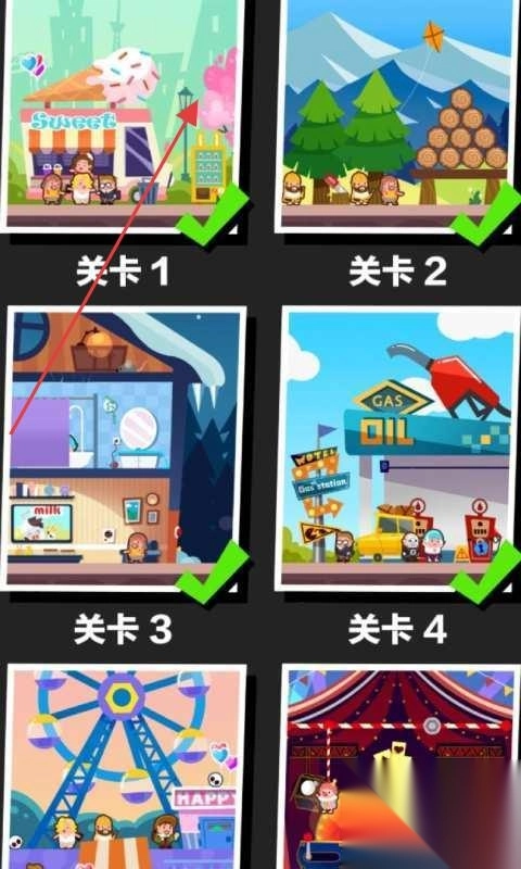 3、关卡选择界面,点击“关卡1”等,进入对应主题场景(如甜品店),开展新冒险挑战。