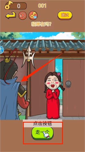 2、在古风场景里,吕布持枪的经典形象会出现。此时,长按方天画戟并拖动到最佳攻击位置。完成调整后,点击“走一个”按钮。