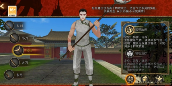 侧重魔法攻击,属于气功型武器,同样为双手装备,不可持盾。偏向远程法师流派,能够使用雷属性气功展开持续远程群攻,并辅修冰系气功掌握多段控制手段。同时,也能转向辅助治疗体系,以内功气功为主,搭配冰系气功,能灵活进行队伍治疗、复活同伴并解除异常状态。